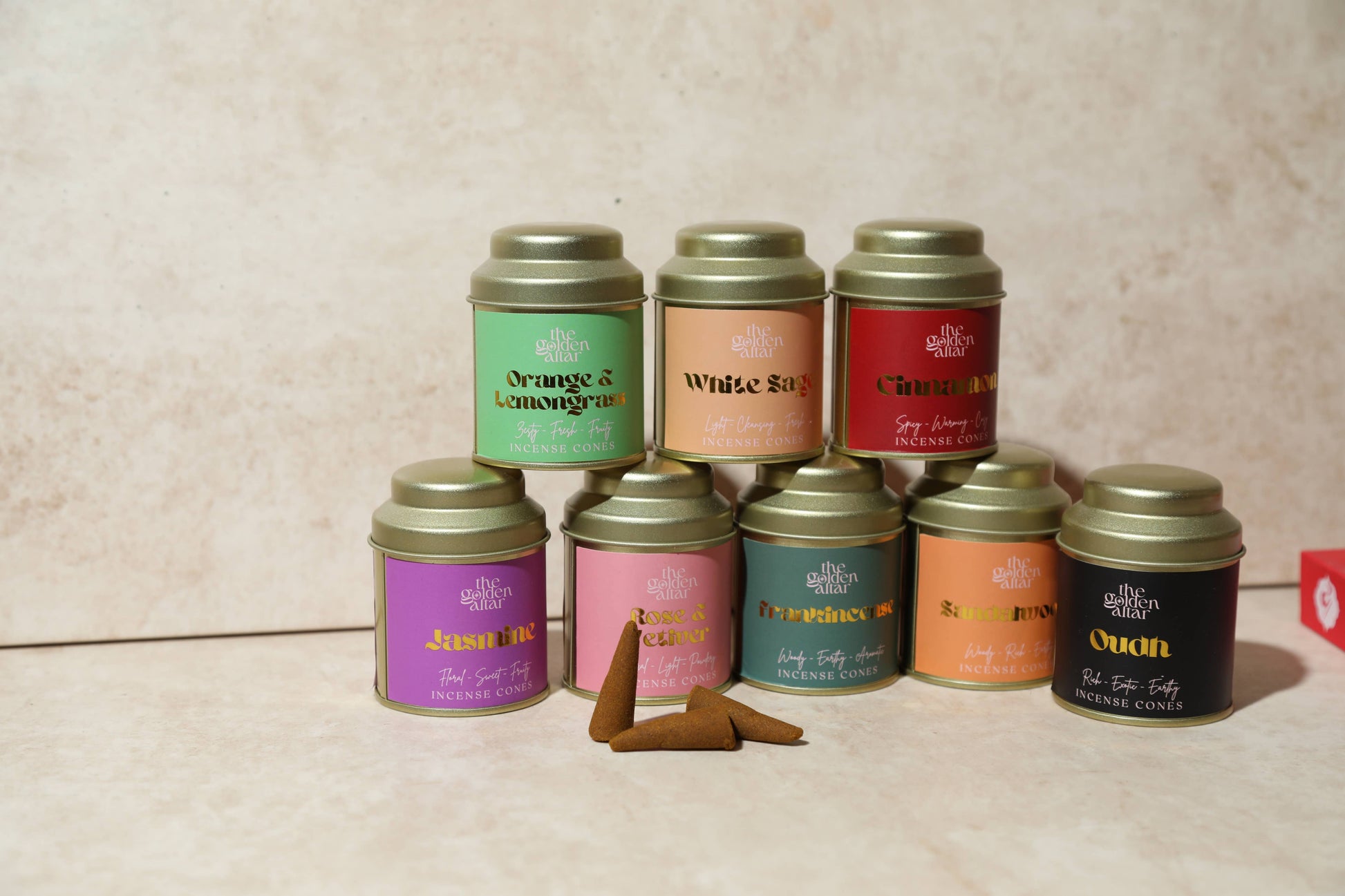 Experience the tranquility of our natural Incense Cones. These premium cones, with a generous burn time of 30-40 minutes each, fill your space with soothing aromas that enhance relaxation and meditation. Our tins hold approx. 15-20 cones / 45grams. They come in a gold tin. Available in: White Sage Oudh Frankincense Cinnamon Rose & Vetiver Jasmine Orange & Lemongrass Sandalwood