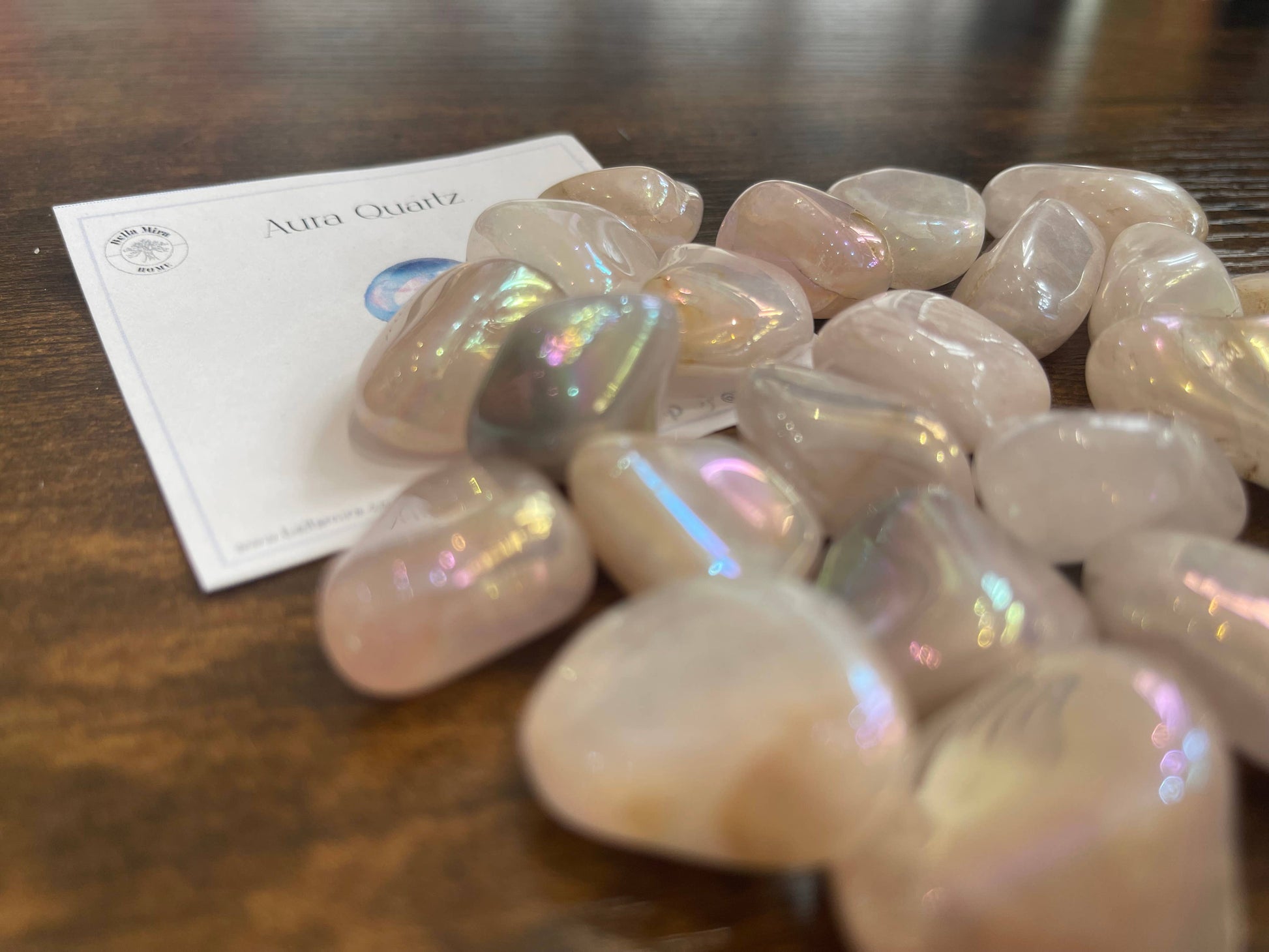 The energy of Rose Aura Quartz aligns it with the higher chakras and is said to attract love and promote self-acceptance.