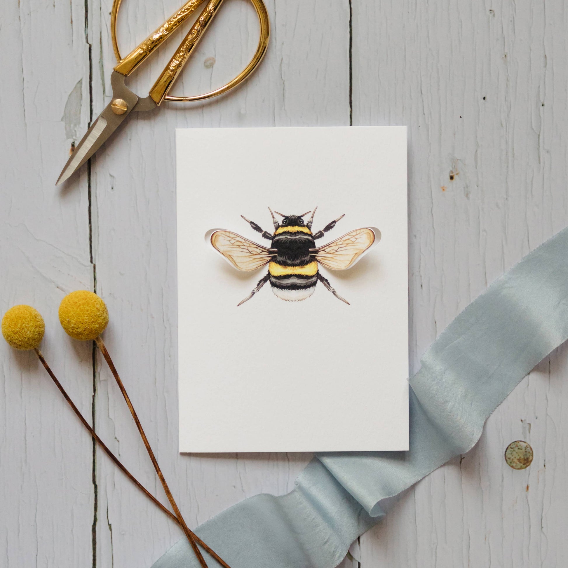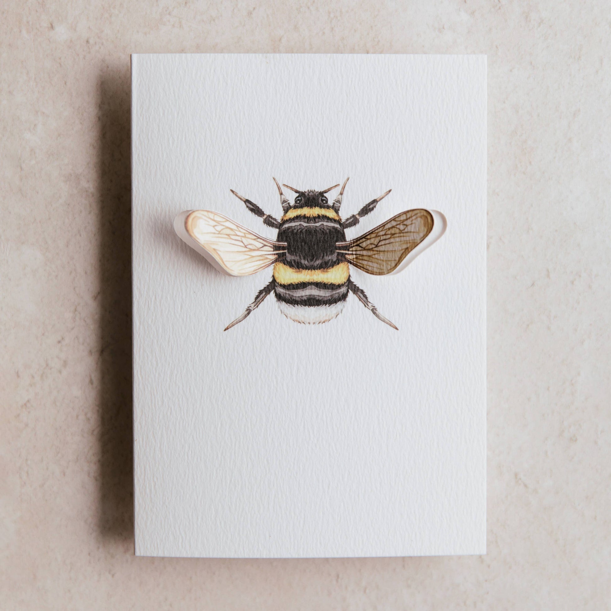 This intricately detailed greeting card features an original watercolour bumble bee illustration with delicate 3D pop out wings that almost ‘float’ above the card.