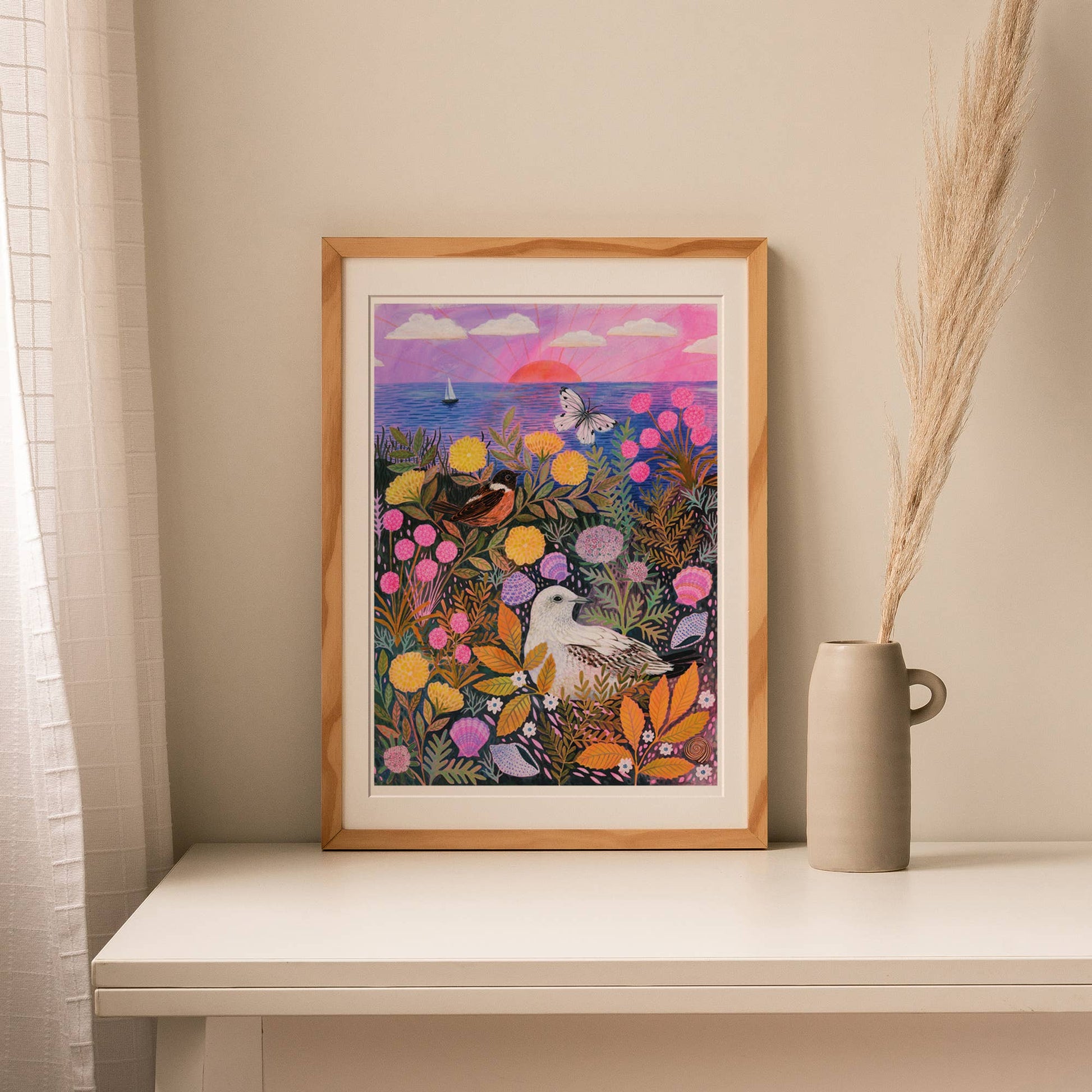 It features a gull nestled in leaves and coastal plants with little shells dotted around, while a stonechat bird looks out over the ocean at the setting sun.