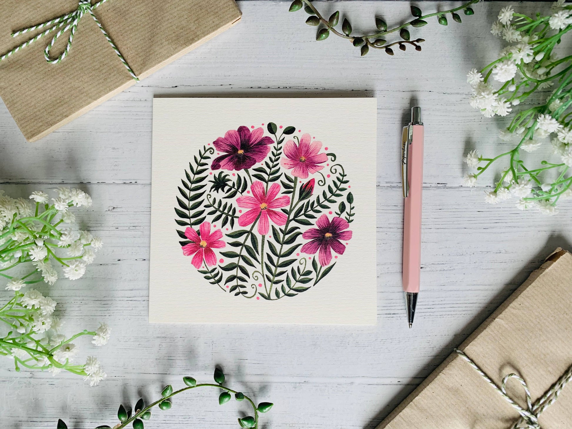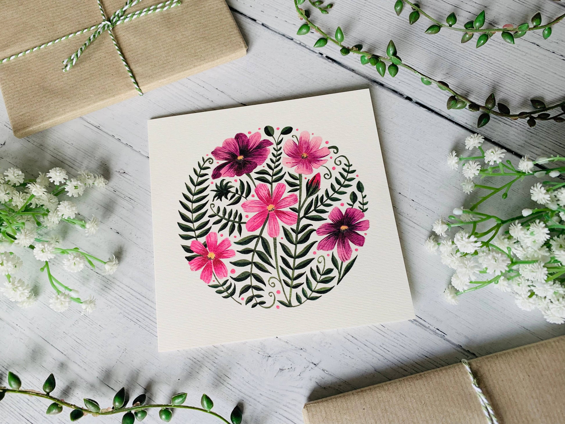 Luxury square greeting card, printed in the UK on textured Aquerello paper. Each card comes packaged with a Kraft paper envelope and a compostable cellophane sleeve. Blank inside.