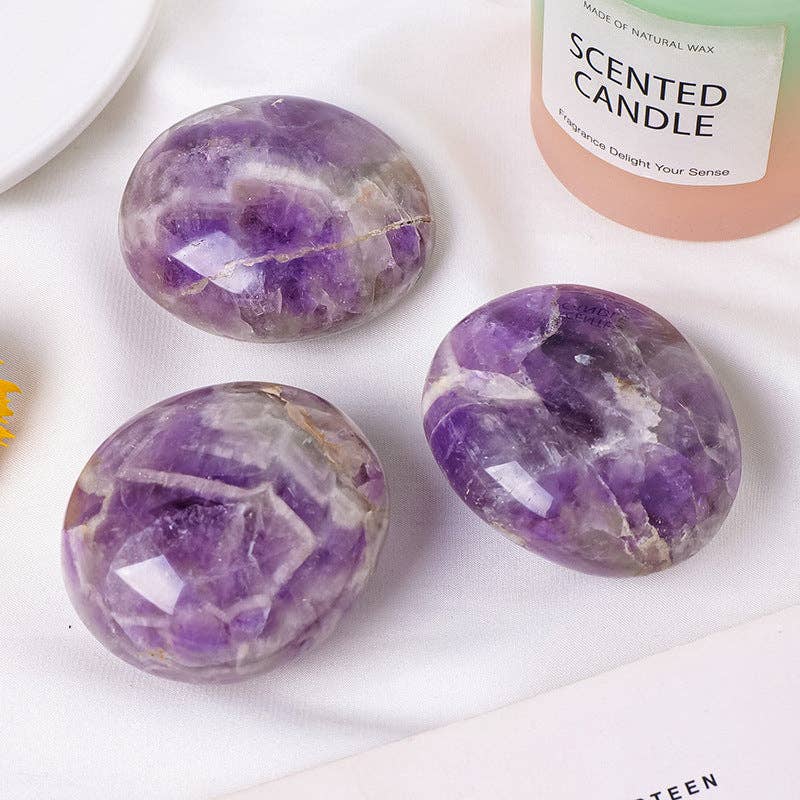 Immerse yourself in the soothing energy of this Dream Amethyst Palm Stone, a beautiful crystal known for its calming and spiritual properties. With its stunning blend of deep purple and white hues, this palm stone is both a visual delight and a powerful tool for emotional healing and spiritual growth.