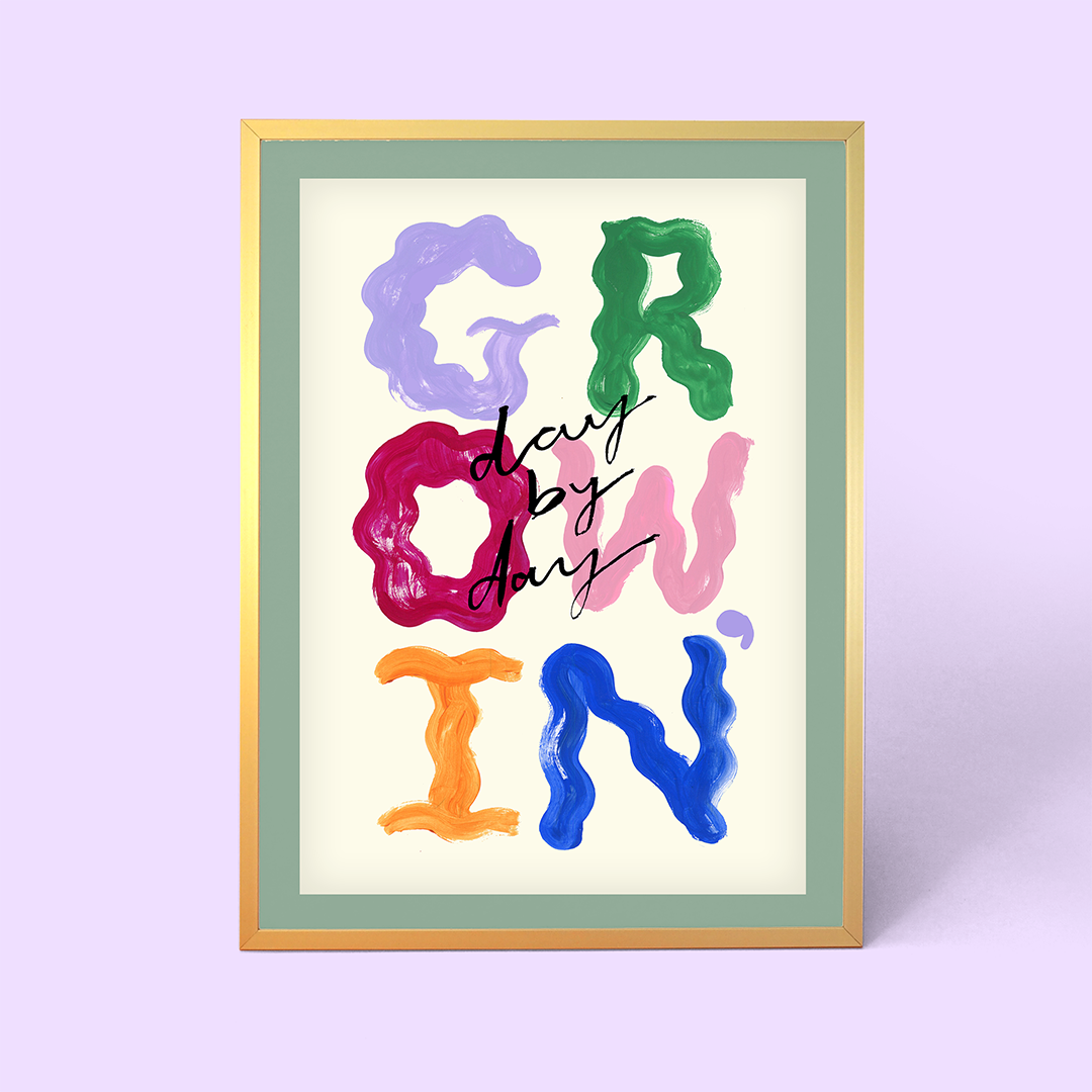 Embrace positivity with our 'Growin' Day By Day' art print. With a calming cream background and a wavy rainbow text, this print is an uplifting reminder to keep growing and moving forward. Perfect for any space that needs a boost of encouragement, whether you're looking for a new home office print or some art to brighten up a bedroom.