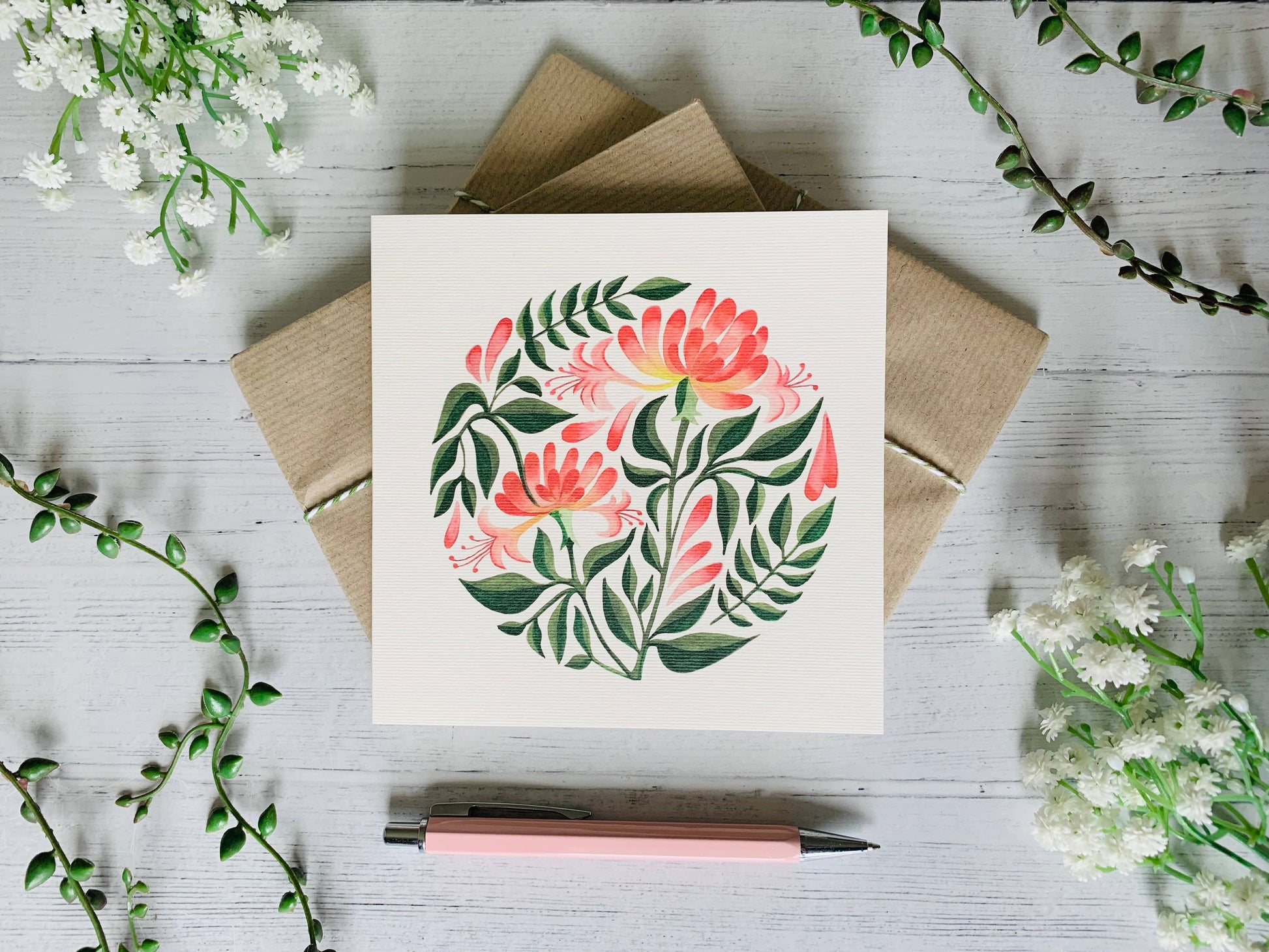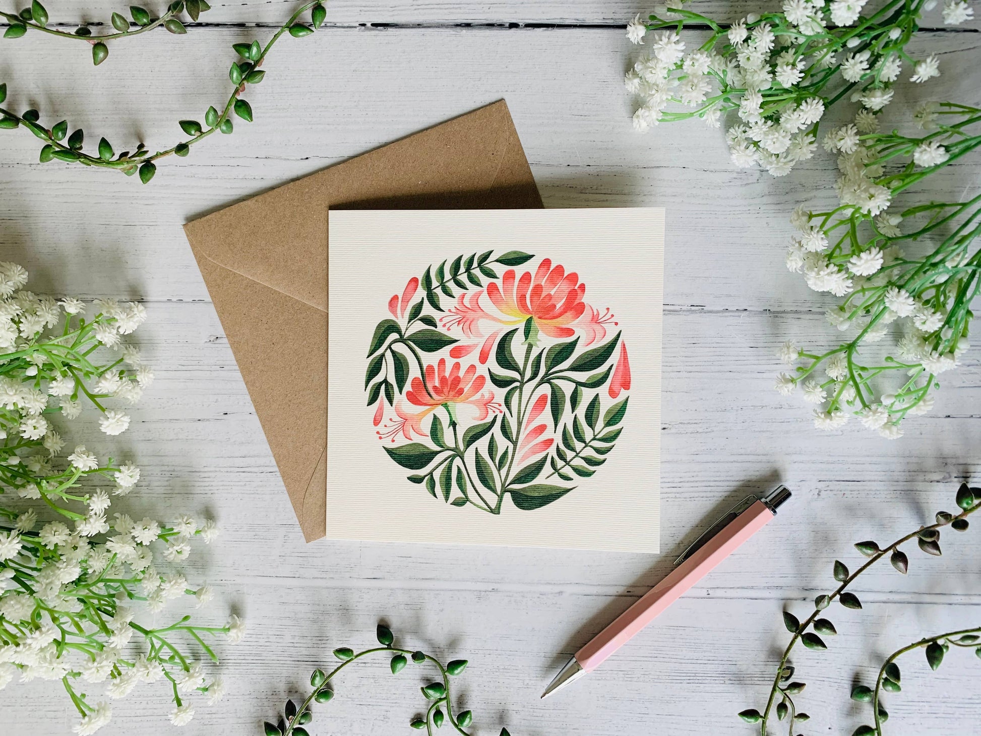 Luxury square greeting card, printed in the UK on textured Aquerello paper. Each card comes packaged with a Kraft paper envelope and a compostable cellophane sleeve. Blank inside.