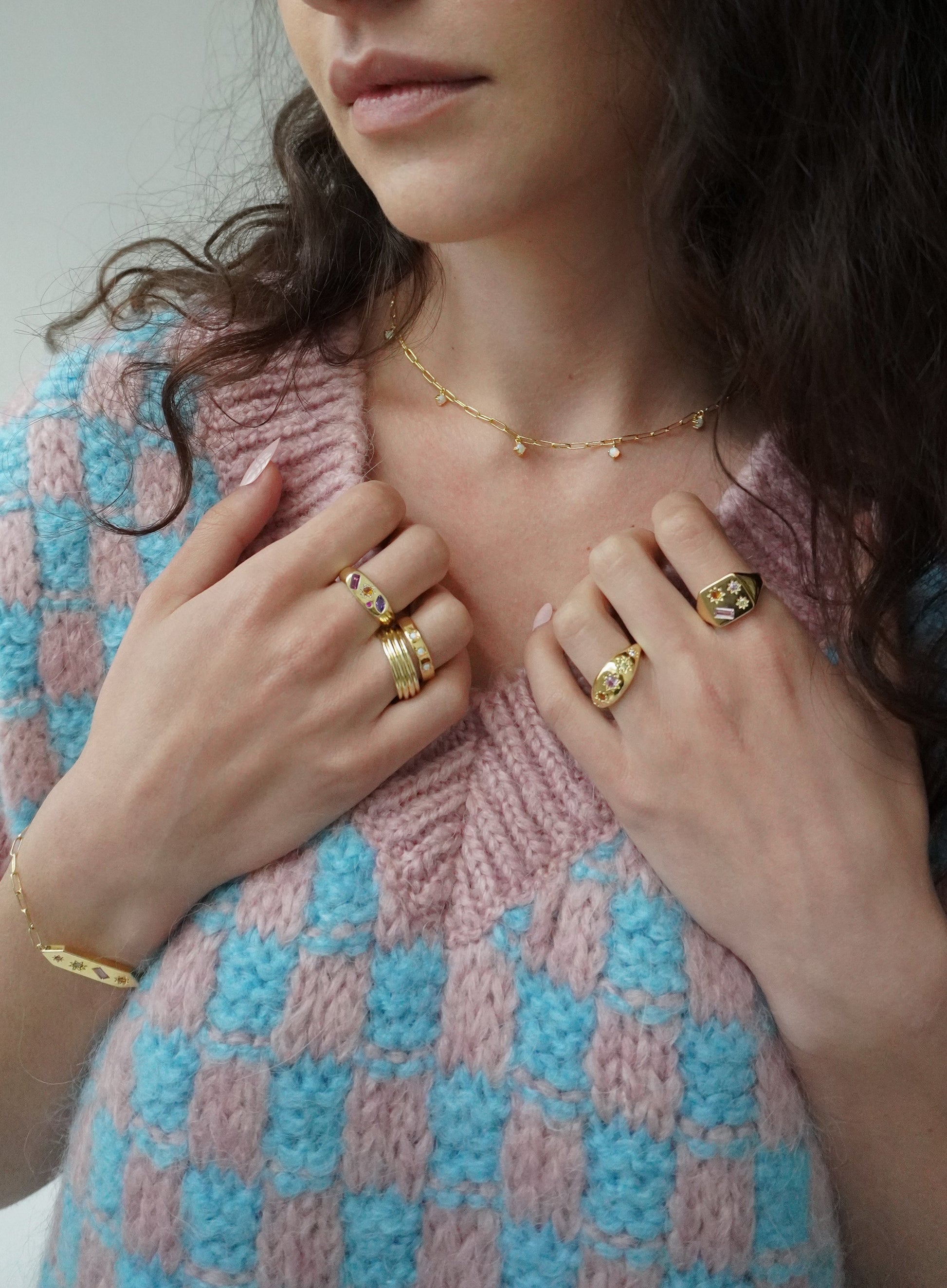 It’s disco time! Our modern take on this vintage style ring is adorned with cz gemstones with a vibrant pop of colour. Like a disco ball, the coloured jewels, shimmer in the light as you move. Get ready to boogie the night away, the more you dance, the more it sparkles!
