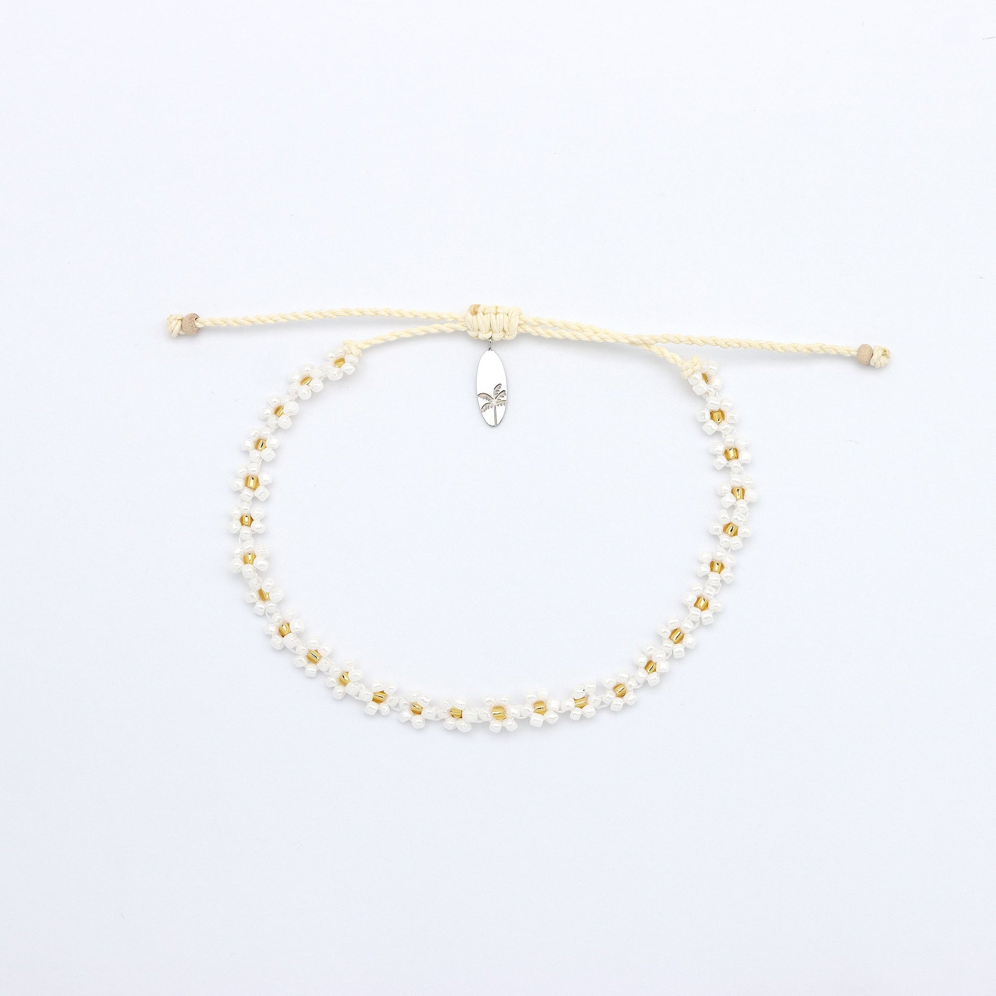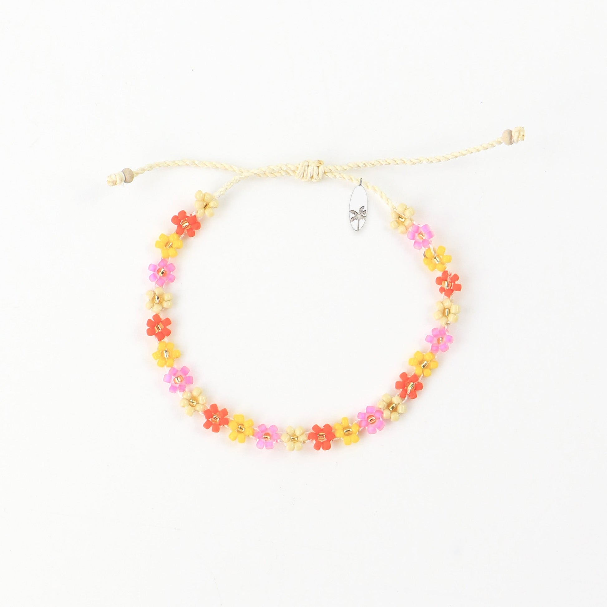 - Made with dainty colourful seed beads including some gold coloured accents, strung on a wax polyester cord, finished with our palm tree surfboard charm.