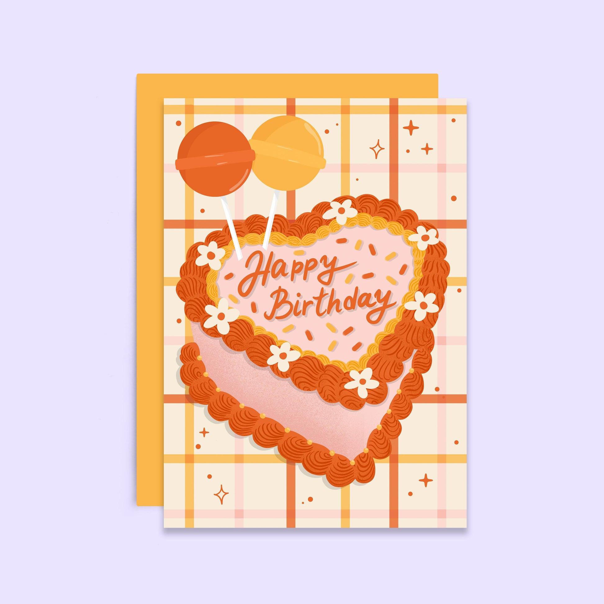 Embrace the comeback of vintage charm with this delightful birthday card! Featuring a captivating illustration of a heart-shaped cake adorned with creamy frosting and vibrant floral embellishments in a cheerful yellow, orange, and pink palette, this card is perfect for sending sweet greetings to the special women in your life.