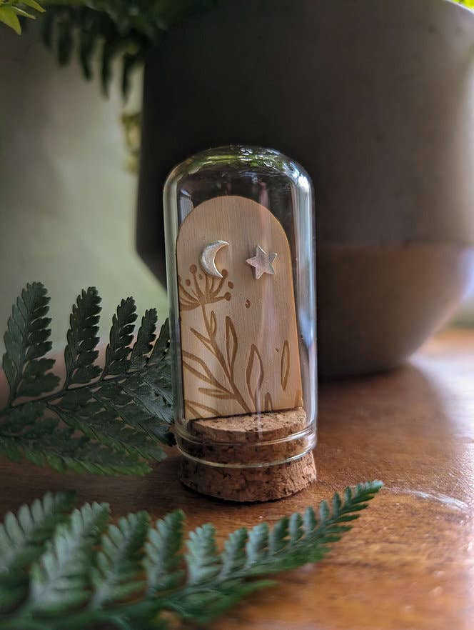 Moon & Star Sterling Silver Studs in Glass Terrarium Tube