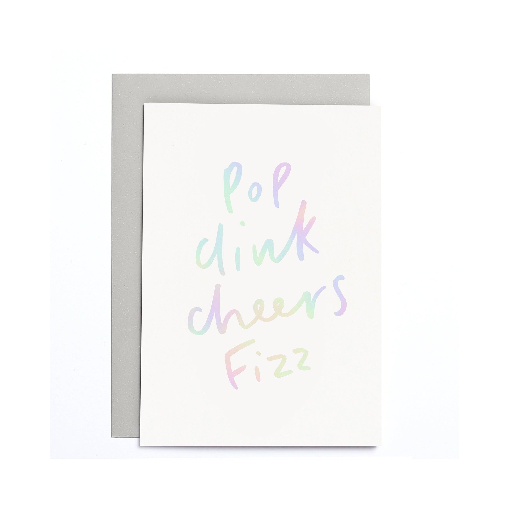 This simple, bold and charming small celebration greeting card has been illustrated with a hand lettered message 'Pop Clink Cheers Fizz' pressed with pearlescent foil.