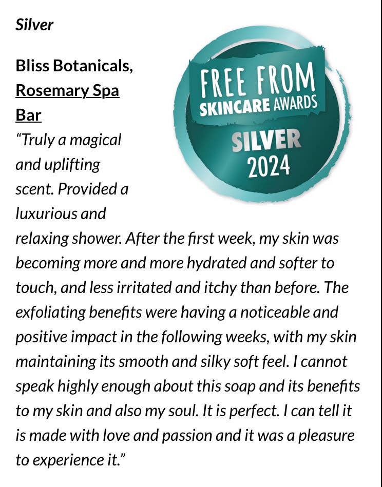 Bliss Botanicals Rosemary Spa Bar was awarded a Silver medal in the 2024 Free From Skincare Awards.