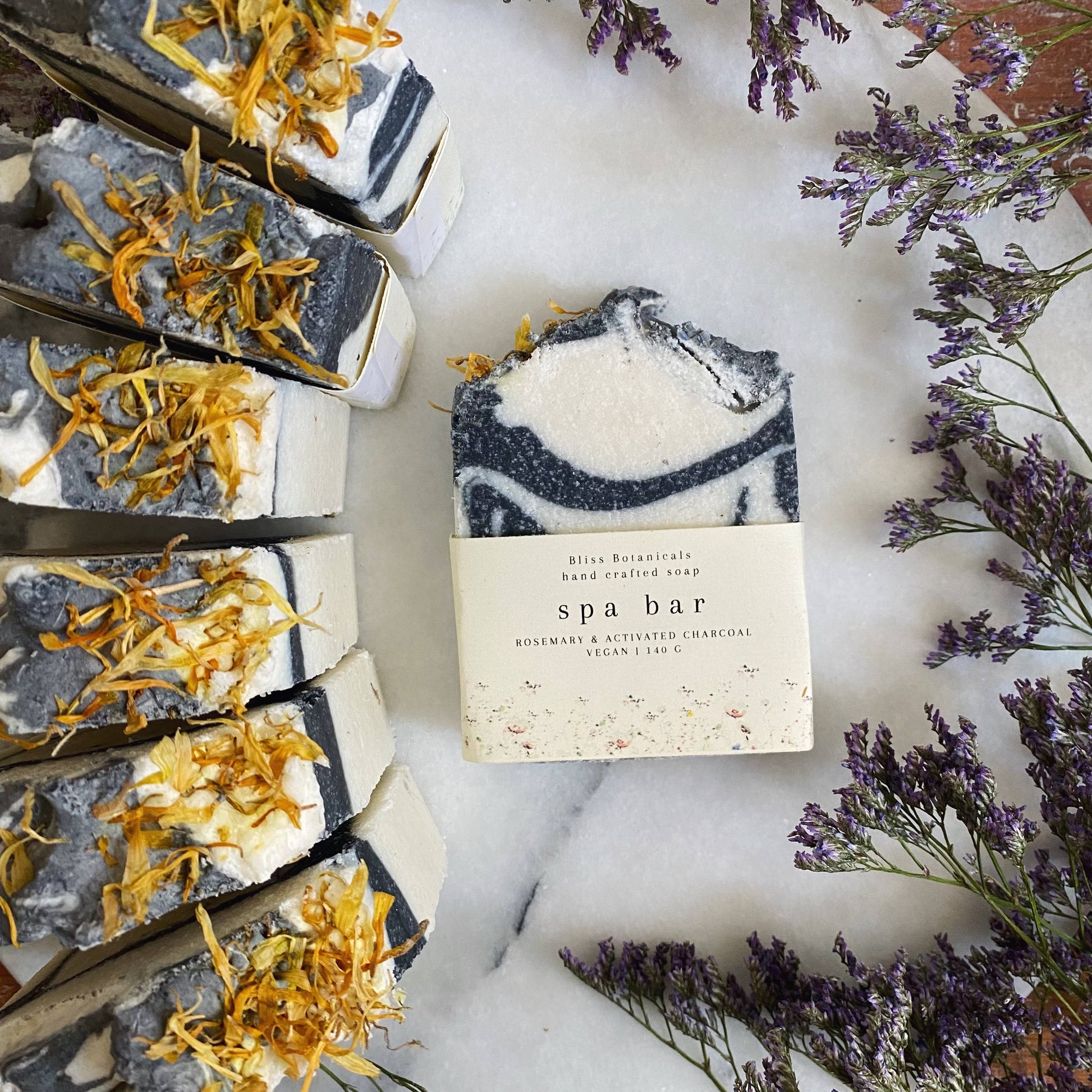 The Award Winning Rosemary and Activated Charcoal 'Spa Bar' is a nourishing and moisturising cold processed soap made with a blend of mostly coconut oil, along with dead sea salt to make it gently exfoliating, highly scented with pure Rosemary Essential Oil and topped with calendula petals and dried rosemary.