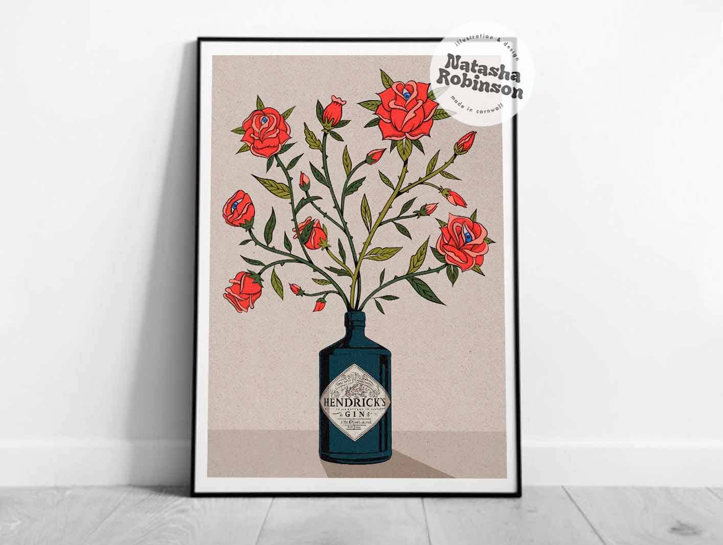 Roses & Hendricks Gin Flower Floral Gift Art Print in A4