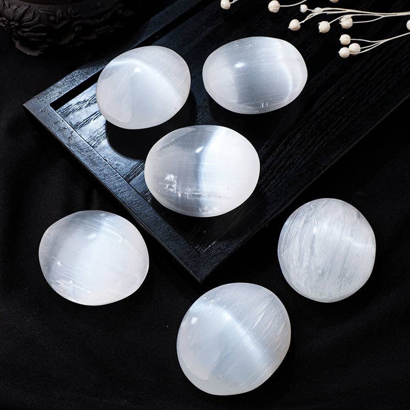 Selenite's Enchanting Properties * Known to promote feelings of peace and tranquility * Encourages mental clarity and focus * Believed to cleanse and purify the aura and surrounding environment Product Details * Gemstone: Genuine Selenite * Size (approximate): 4cm * Please note: Selenite is a soft mineral. Each palm stone is unique and may have slight variations in size, shape, and natural inclusions.