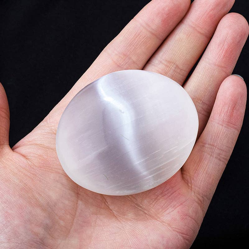 Unwind and Recharge with the Power of Selenite This beautiful selenite palm stone is a source of pure serenity and cleansing energy. Perfectly sized to fit comfortably in your hand, this calming stone is ideal for meditation, crystal healing, or simply carrying with you throughout the day for a touch of tranquility.
