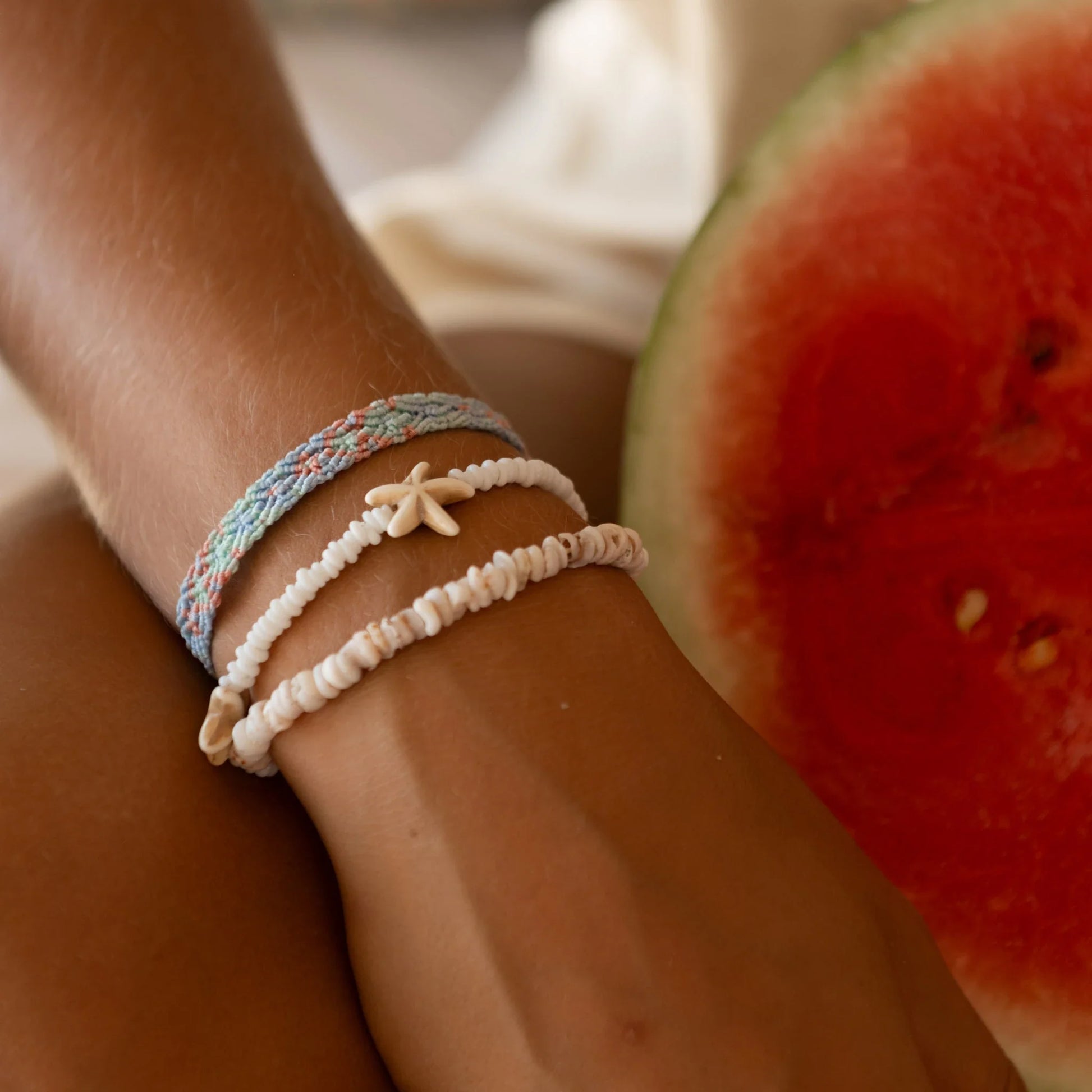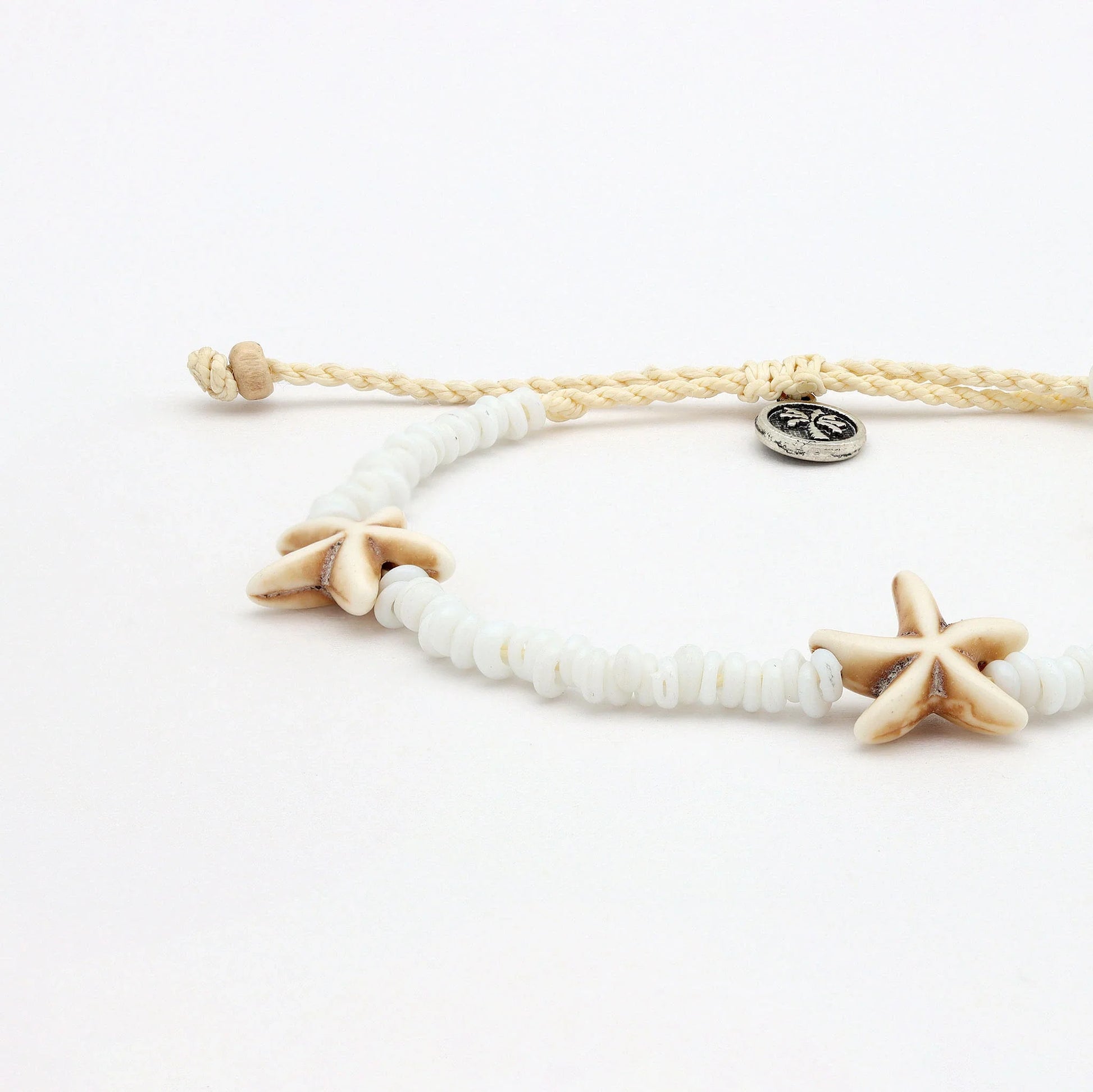 - Made with a wax polyester cord, irregular shell beads and a glass starfish charm.