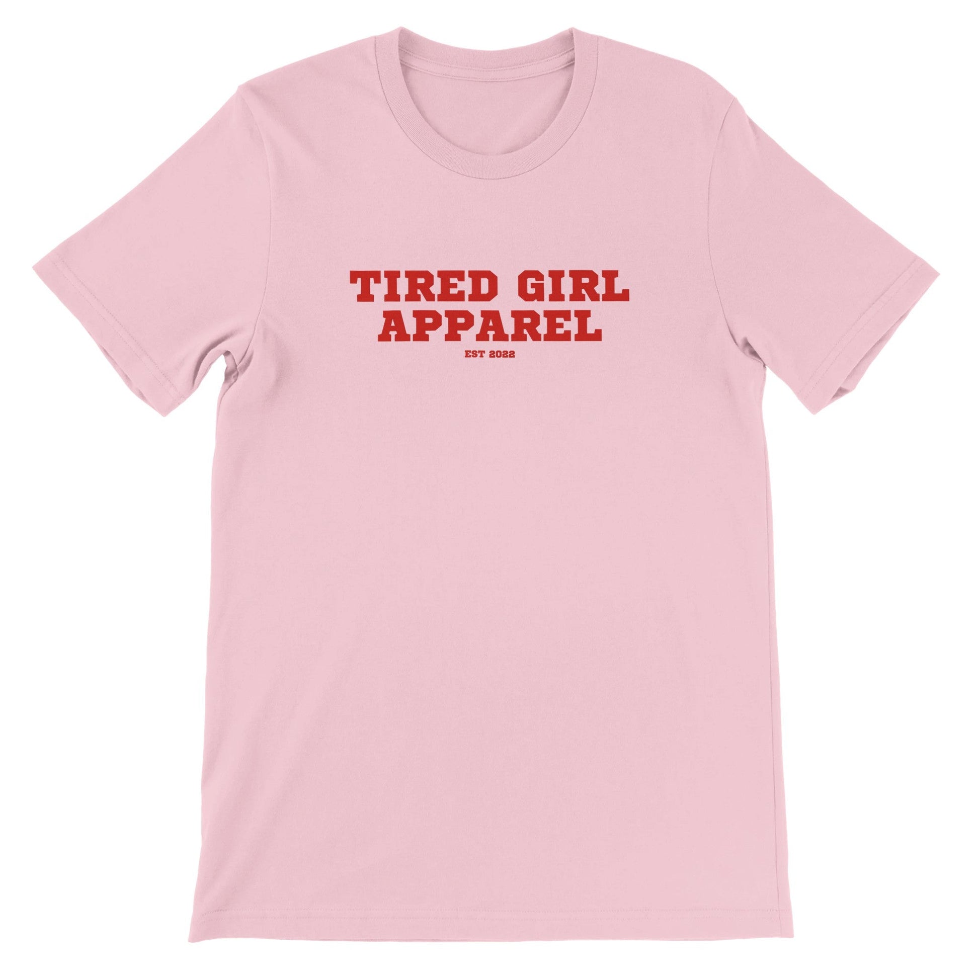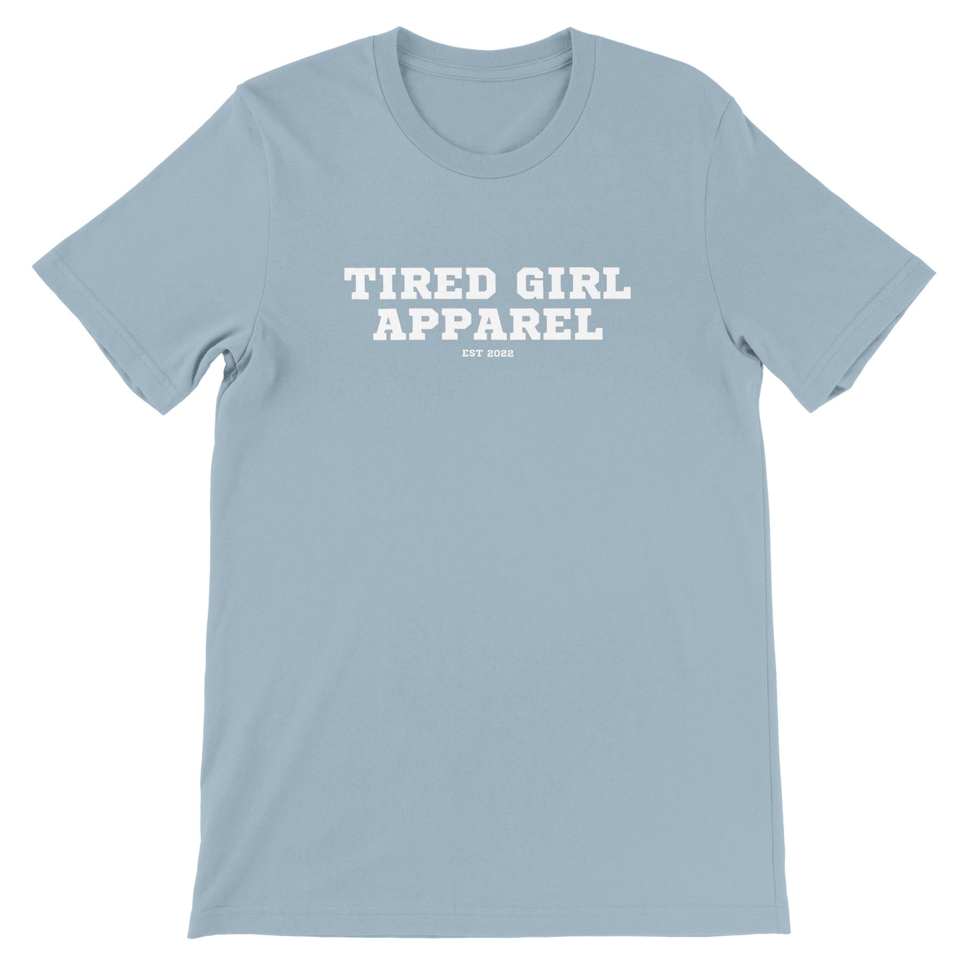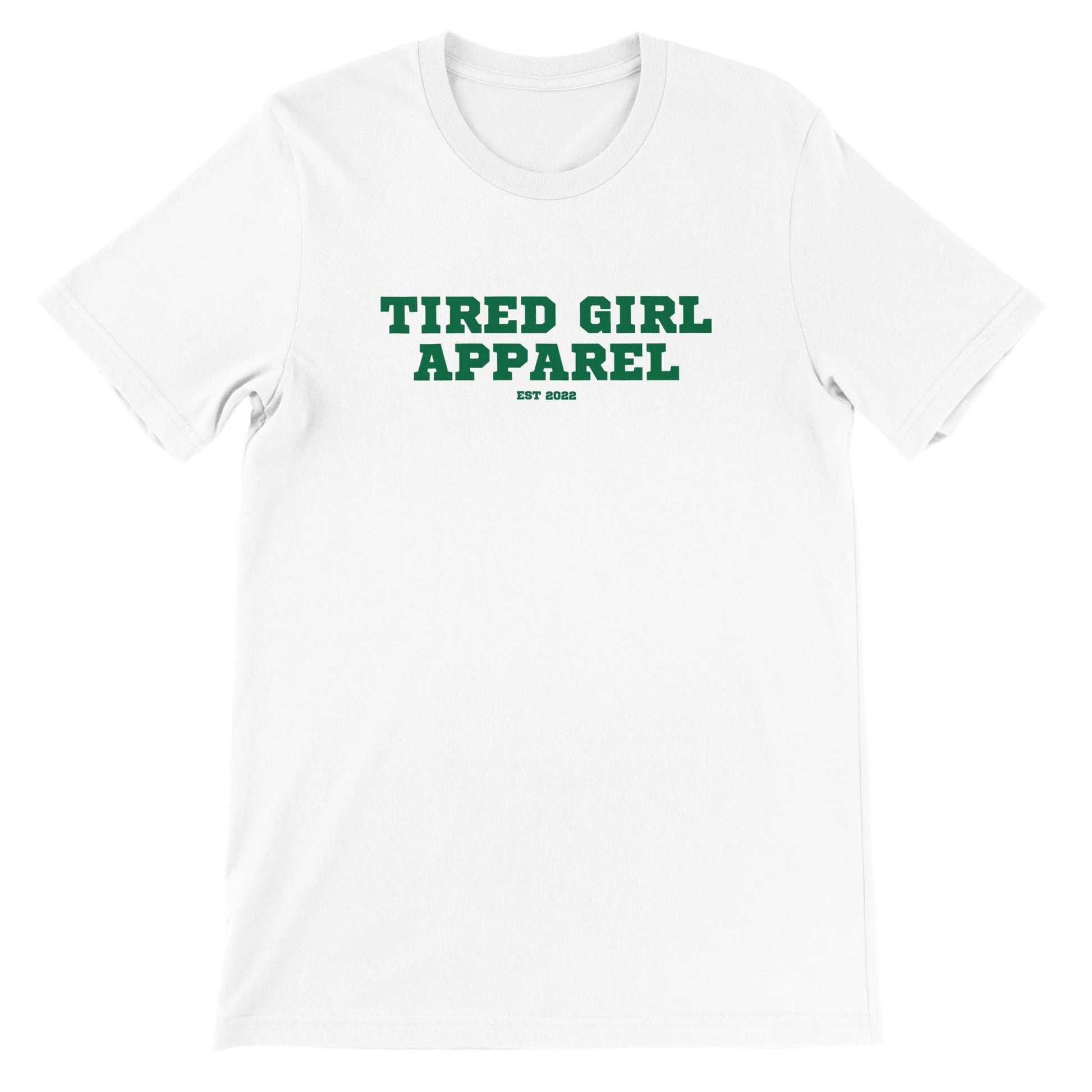 Super soft t-shirts with a college style Tired Girl Apparel branding printed on the front.