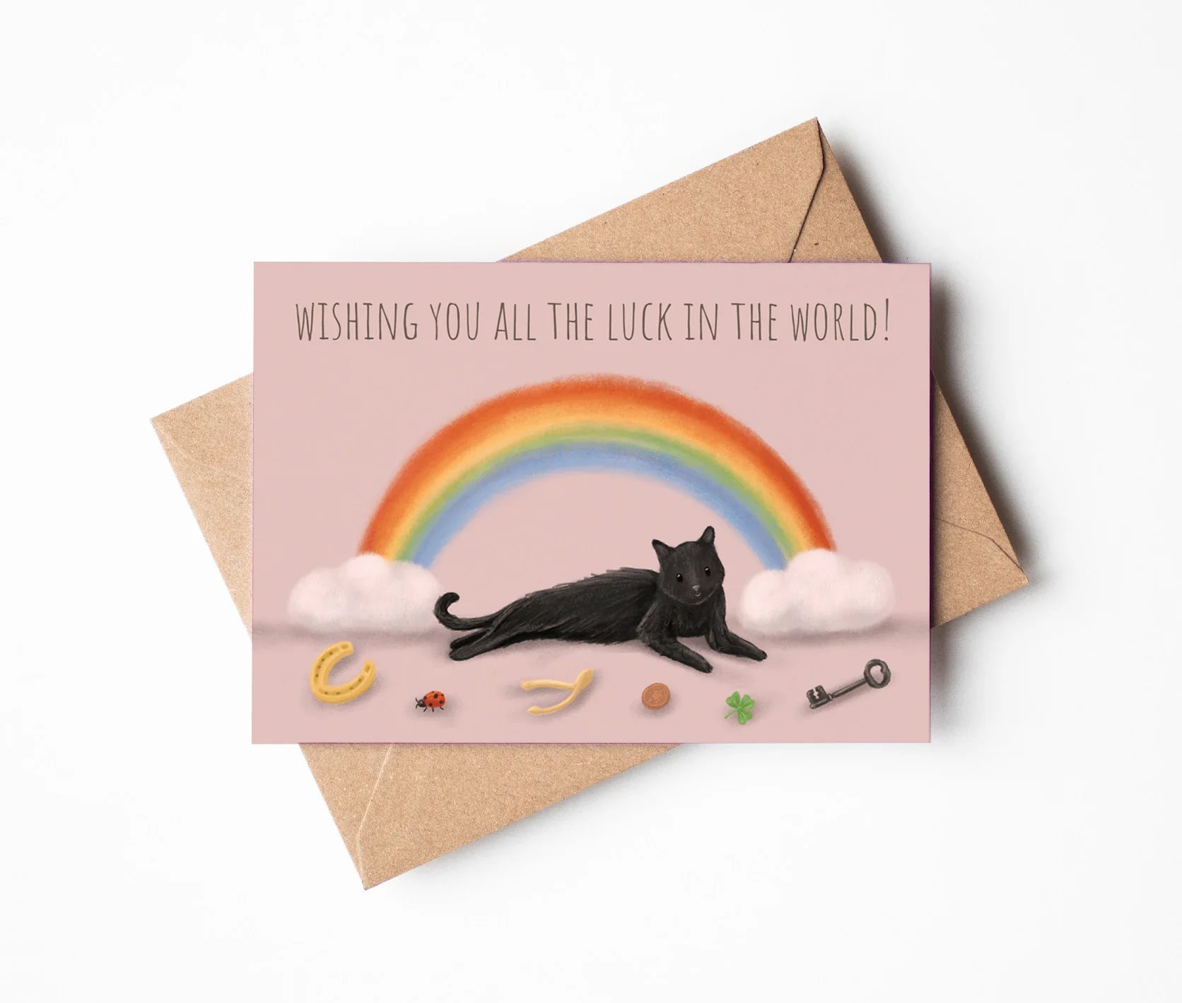 Send someone good luck wishes with this card from our Dogs & Mogs range featuring a black cat laid under a rainbow surrounded by good luck charms - a horsehoe, ladybird, wishbone, penny, clover and a key.