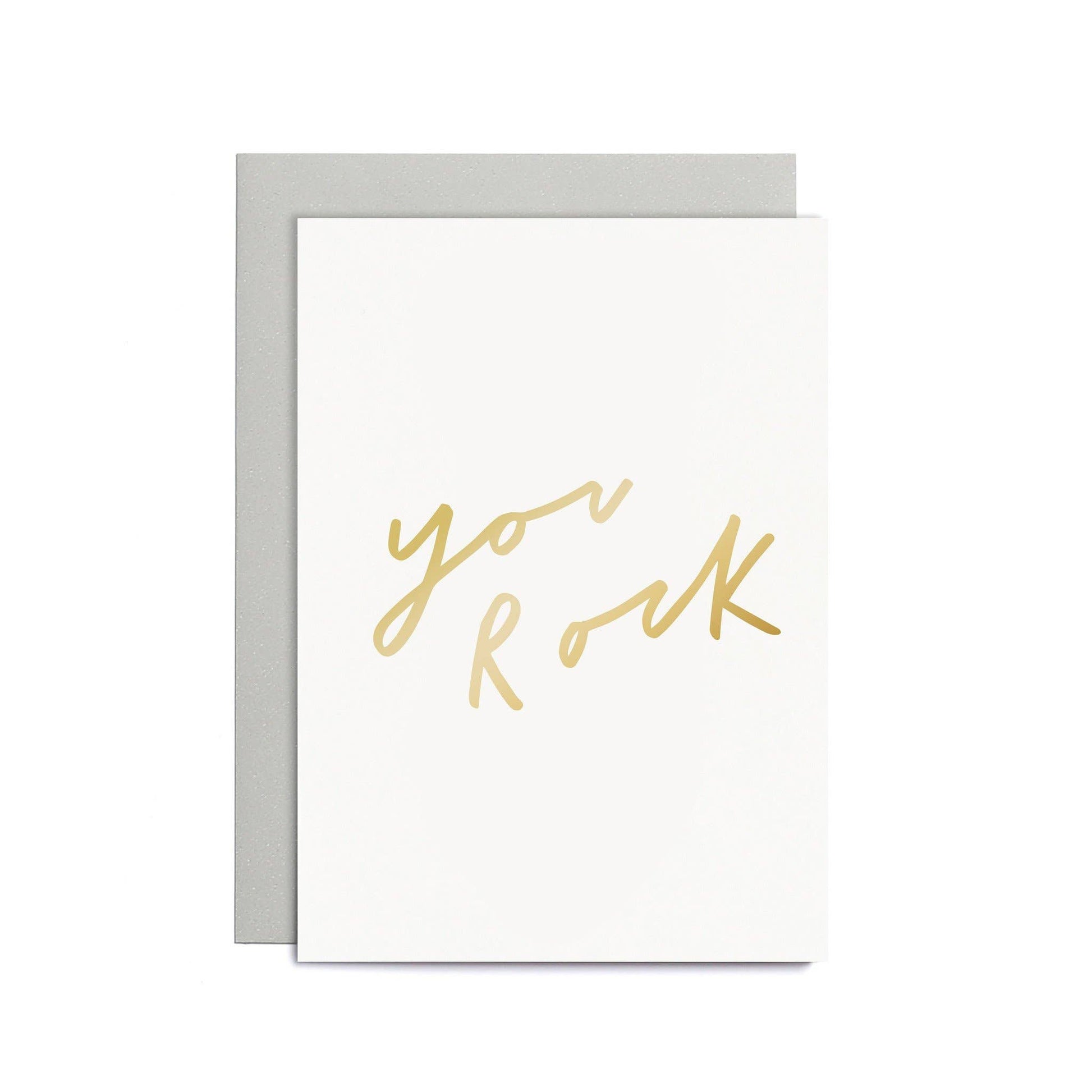 This simple, bold and charming small greeting card has been illustrated with the hand lettered message 'you rock' pressed with gold foil.